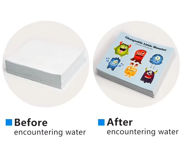 Khi ngâm vào nước, nó lập tức chuyển sang trạng thái nhão và nhanh chóng phân tán. Màu sắc in trên đó sẽ lan rộng và biến dạng tương ứng. Quá trình thay đổi màu sắc là không thể đảo ngược. Sau khi tiếp xúc với nước, nó sẽ hiển thị màu vĩnh viễn.