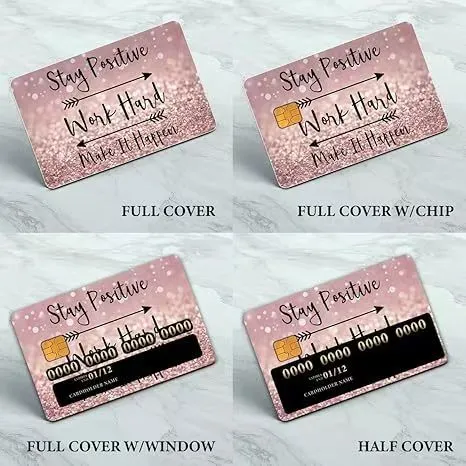 Nhãn dán thẻ tín dụngcó nhiều kiểu dáng khác nhau, bao gồm bìa đầy đủ, bìa nửa, bìa có cửa sổ cho số thẻ hoặc chip và bìa có khu vực cắt sẵn cho vi mạch. Kích thước thường được thiết kế để vừa với thẻ tín dụng có kích thước tiêu chuẩn, khoảng 5,3 * 8,5cm.