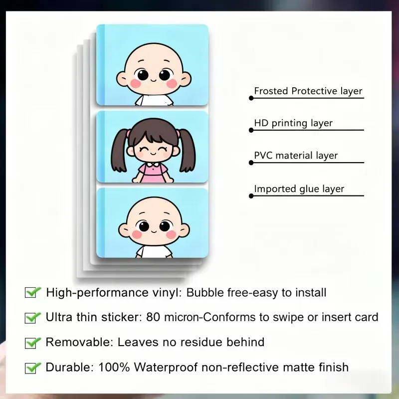 Da thẻ tín dụng thường được làm từ các vật liệu như nhựa PVC, mỏng, dễ dán và tháo, thường có bề mặt mờ chống thấm nước và chống trầy xước để đảm bảo độ bền và vẻ ngoài lâu dài. Nó không thấm nước, chống rách và tương thích với in UV độ phân giải cao.