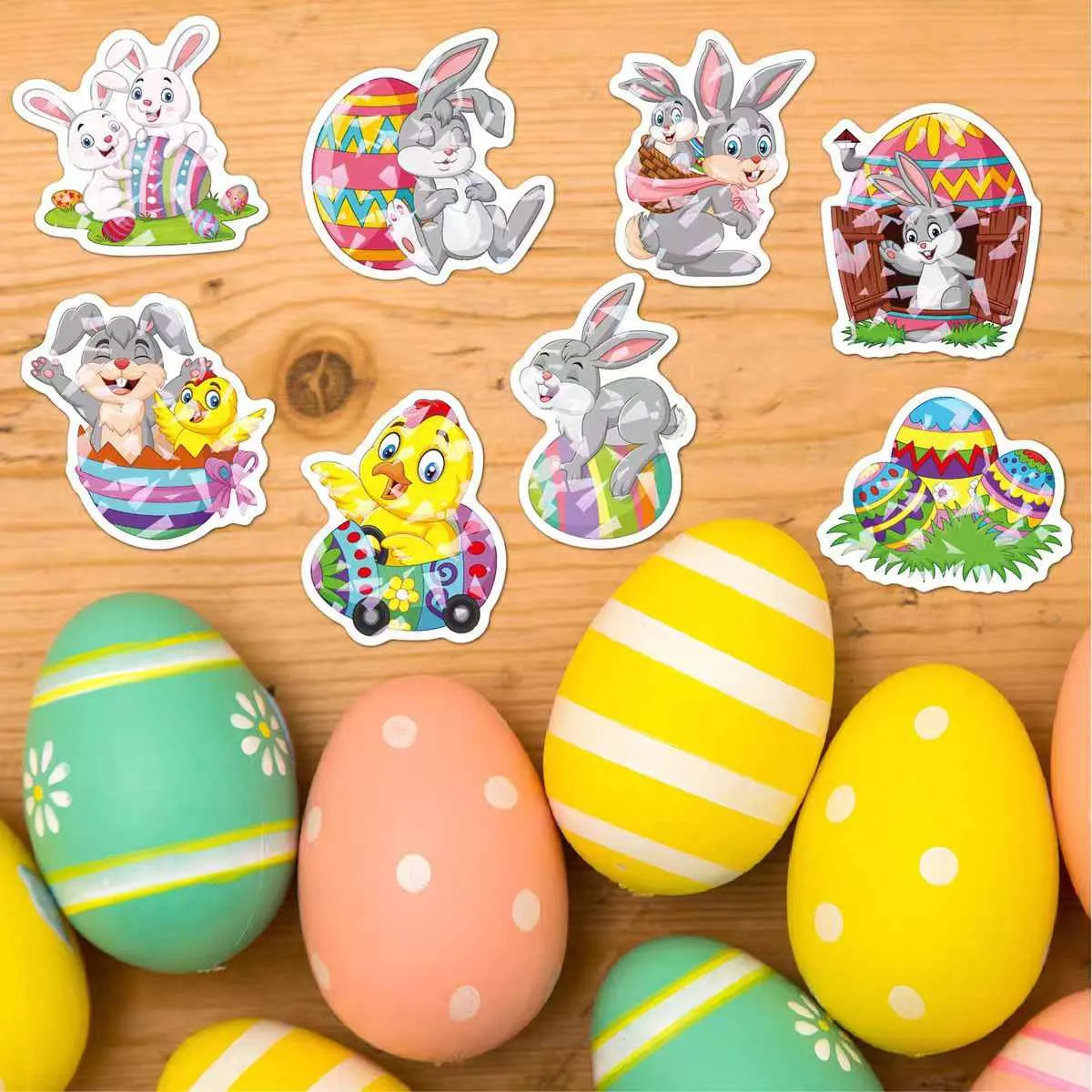 Thích hợp cho nhiều mục đích sử dụng khác nhau trong Lễ Phục sinh: nhãn dán nhỏ cho trứng hoặc vỏ sô cô la, loại vừa cho hộp và giỏ quà và loại lớn để trưng bày trên cửa sổ. Loại bỏ dễ dàng mà không có cặn bám trên các bề mặt như thủy tinh, nhựa hoặc gỗ.