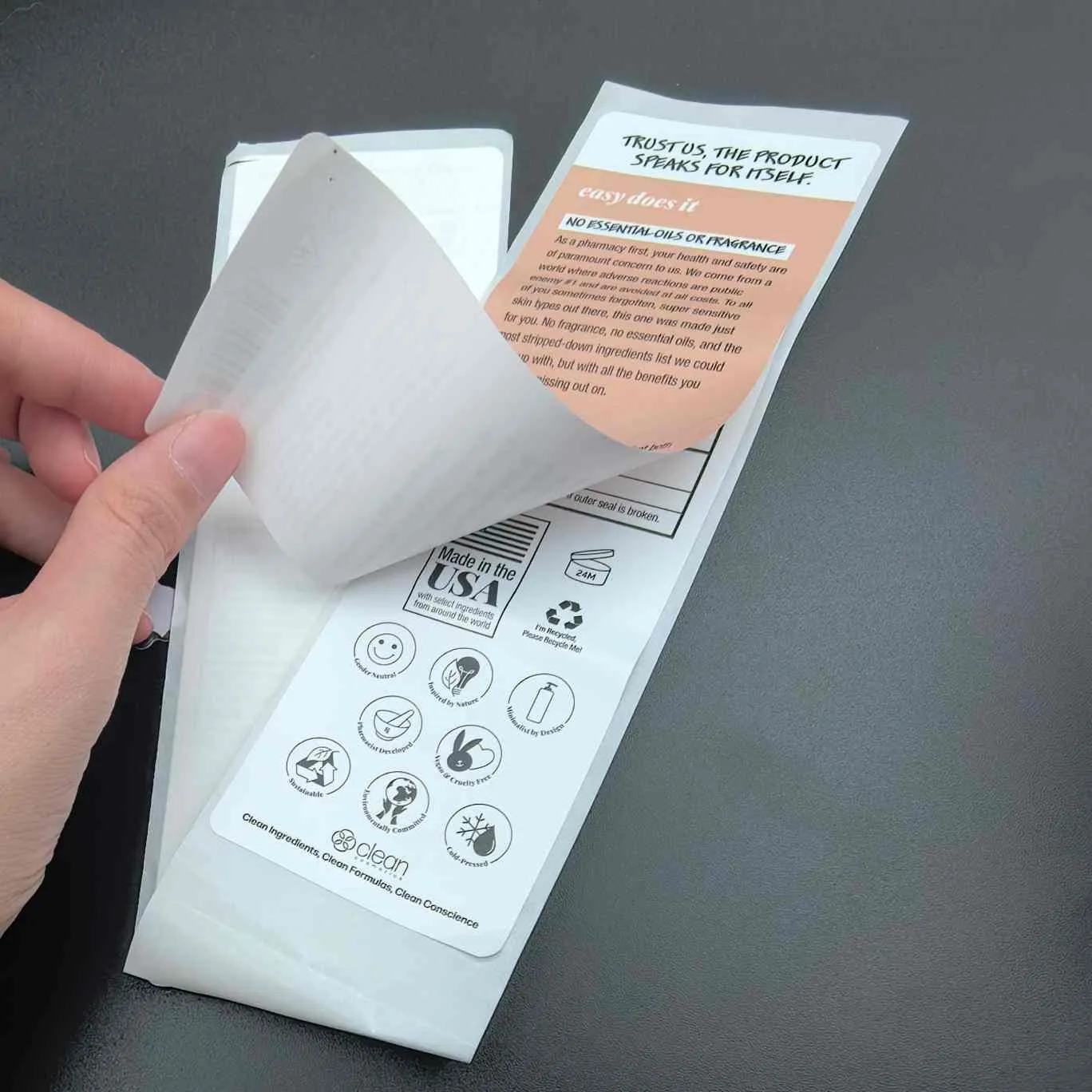 Đáp: Đó là nhãn có hơn 2 lớp dành cho mỹ phẩm. Bóc lớp bên ngoài để lộ thêm thông tin về lớp bên trong mà không cần mở rộng kích thước nhãn.