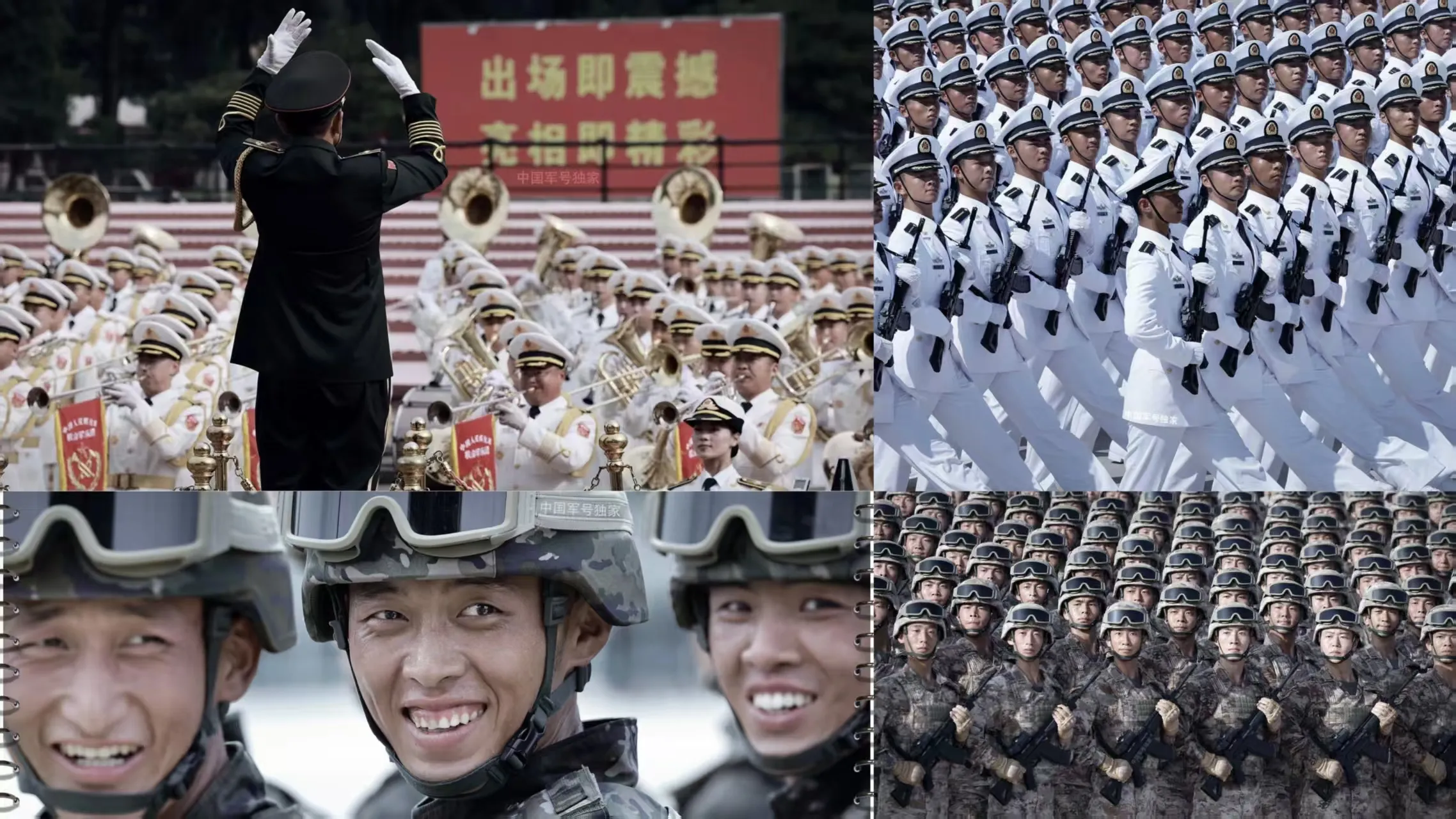 Tại Quảng trường Thiên An Môn, 45 đội hình và tiếng vang được thông qua theo trình tự, và một ban nhạc quân sự chung bao gồm hơn một ngàn sĩ quan và binh sĩ đã chơi những âm thanh mạnh mẽ của thời đại.