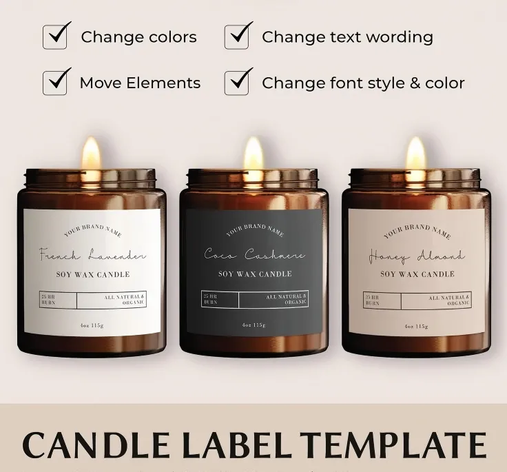 PVC:Cung cấp độ bền tuyệt vời và khả năng chống chịu thời tiết. Nhãn nến thơm PVC có thể được làm thành nhãn trong suốt hoặc có màu. Lưu ý rằng PVC không có khả năng phân hủy sinh học nên có thể không phù hợp với các thương hiệu quan tâm đến môi trường.