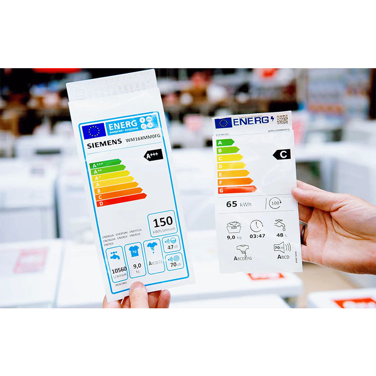 Nhãn tiết kiệm năng lượng của máy giặtlà nhãn được tiêu chuẩn hóa, thường được làm bằng vật liệu bền, không thấm nước với thiết kế trực quan rõ ràng. Wnhãn tiết kiệm năng lượng của máy trothường có kích thước 200 x 300 mm và rất dễ nhận biết trên máy giặt. Wnhãn tiết kiệm năng lượng của máy trocó xếp hạng hiệu quả năng lượng được in trên đó, thường được biểu thị bằng các chữ cái từ A+++ đến G và được mã hóa màu để nhận dạng nhanh.