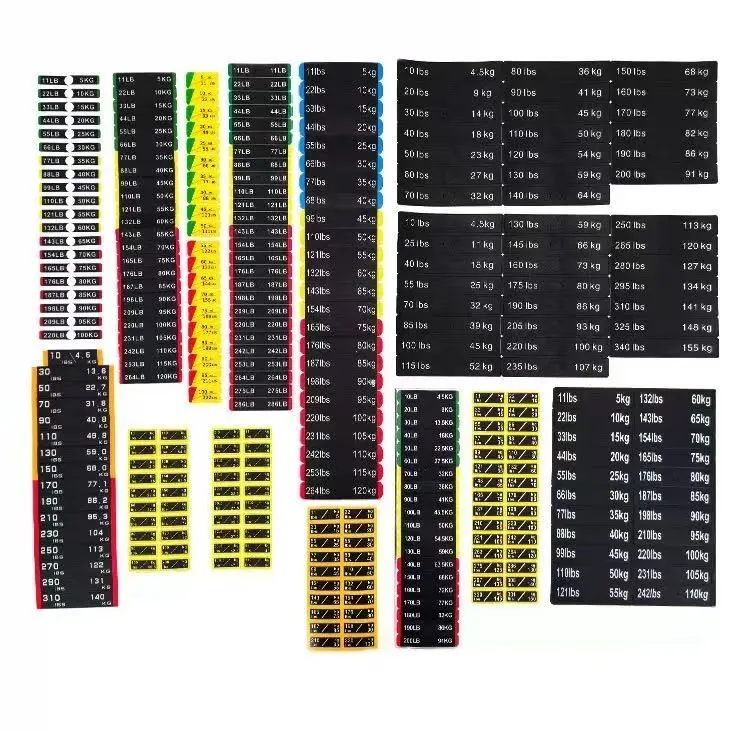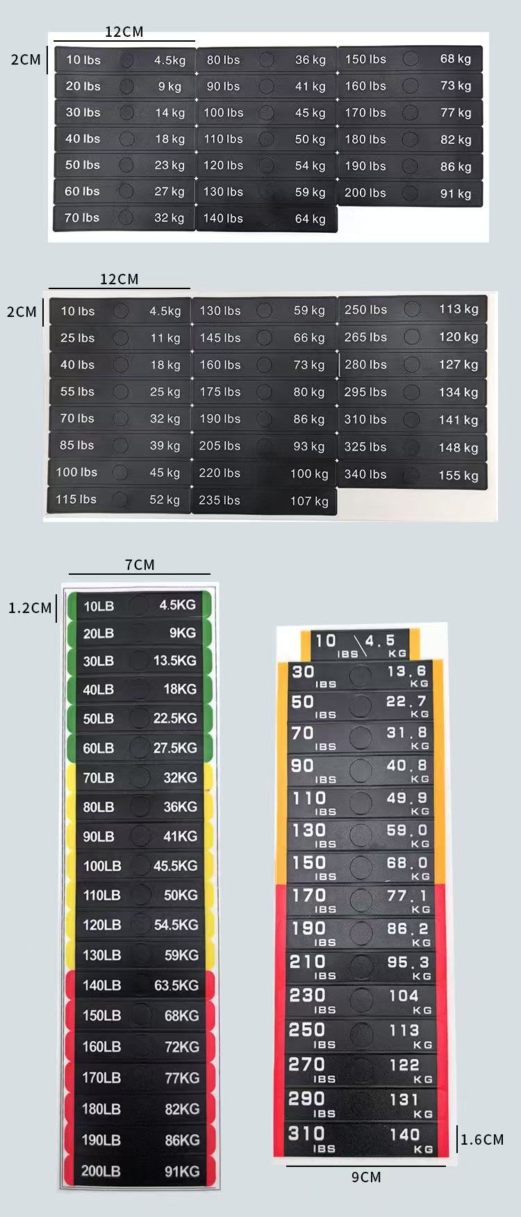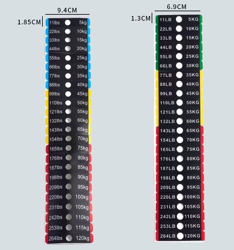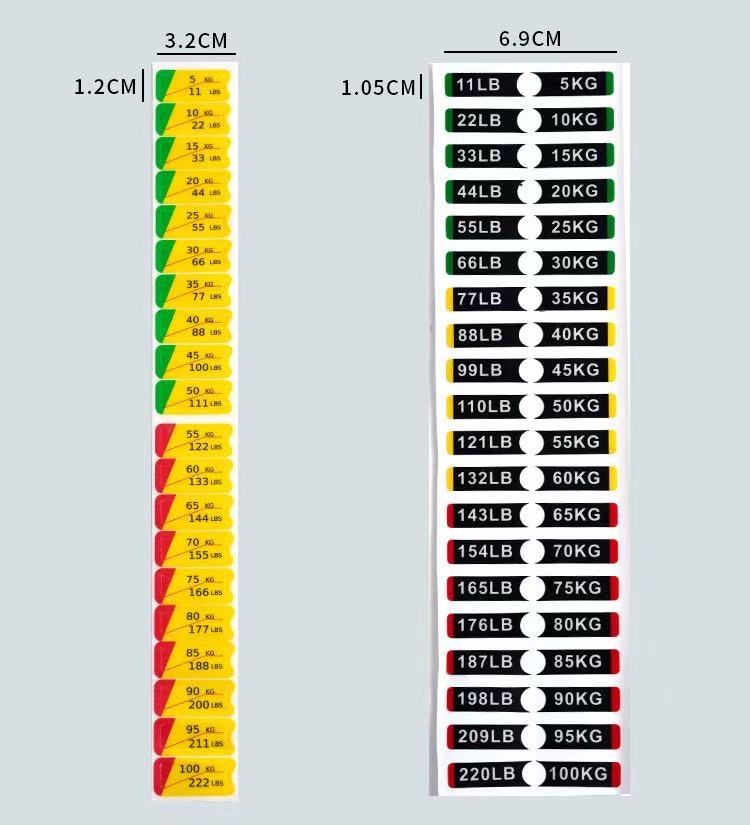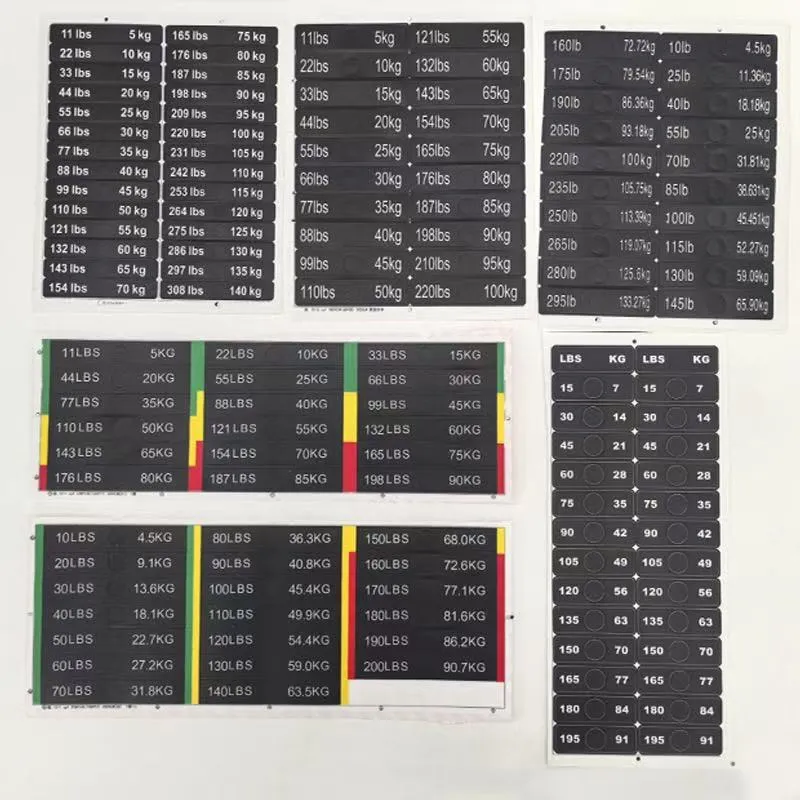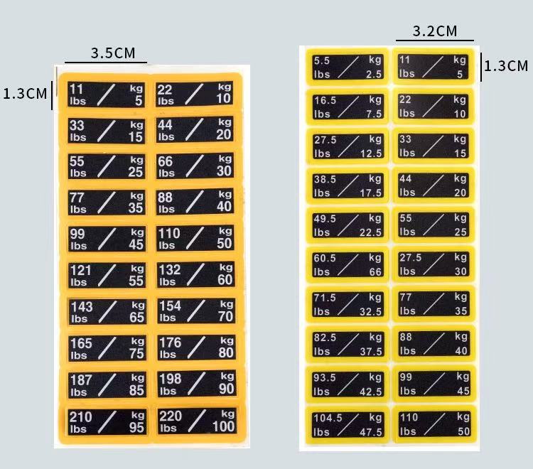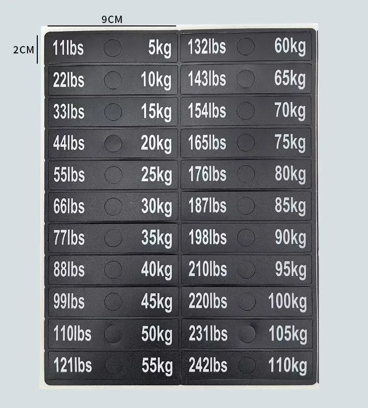 Những miếng dán trọng lượng dành cho khối tạ thiết bị thể dục này là một loại nhãn dán nhận dạng được thiết kế đặc biệt để dán nhãn trọng lượng của dụng cụ thể dục. Chúng thường được làm bằng vật liệu PVC và bạn có thể tham khảo bảng thông số sản phẩm để biết kích thước cụ thể. Các giá trị trọng lượng được đánh dấu rõ ràng trên nhãn dán, giúp người dùng nhanh chóng nhận biết và lựa chọn mức tạ tập phù hợp.