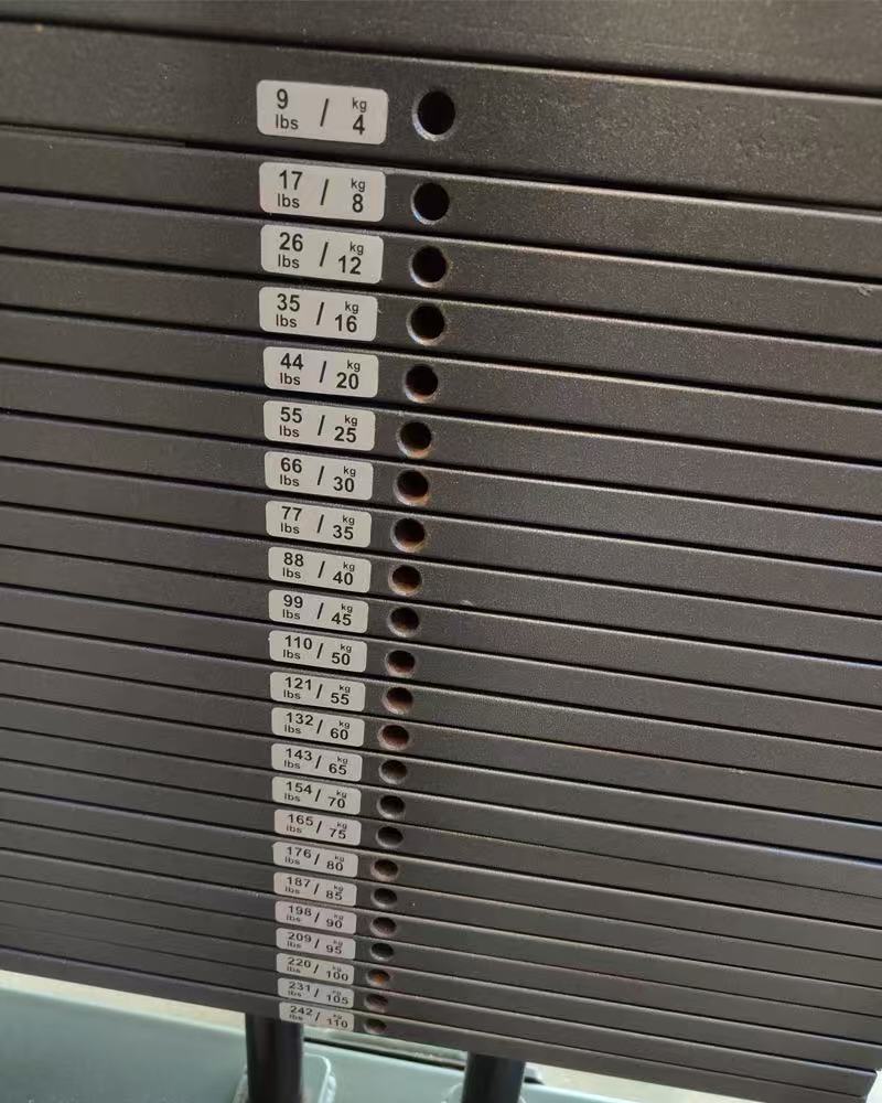 Mỗi nhãn dán đều được đánh dấu rõ ràng các giá trị trọng lượng, giúp người dùng nhanh chóng nhận biết và lựa chọn khối tạ phù hợp với cường độ tập luyện, tránh việc phải cân thường xuyên trong quá trình tập luyện.
